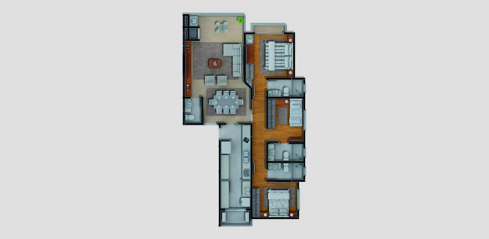 Piso em porcelanato na área social/ laminado madeira nos dormitórios