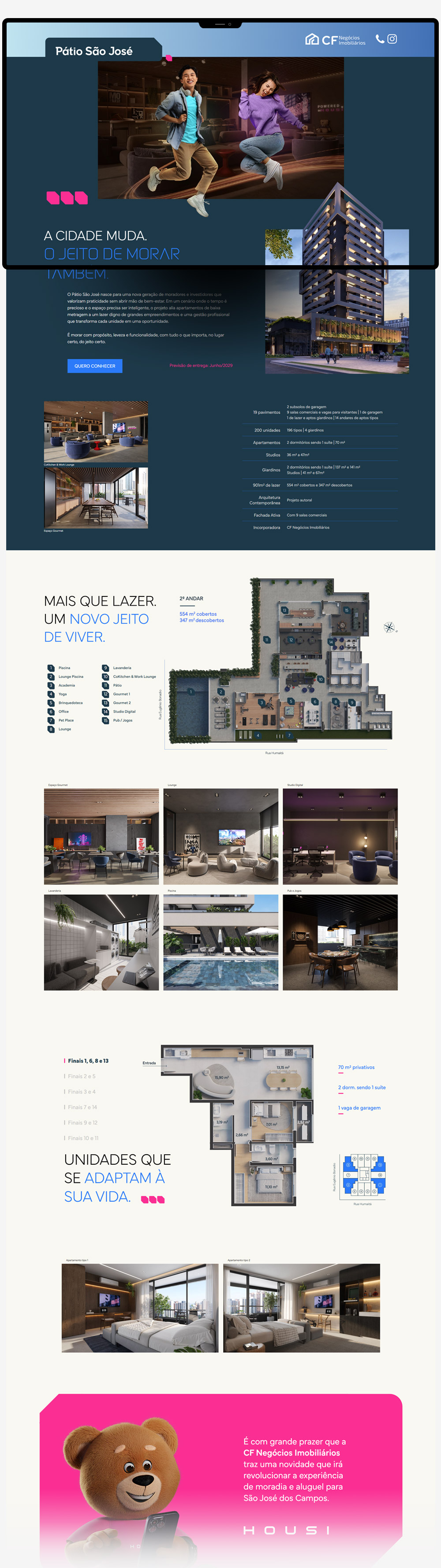 Além de apresentar os diferenciais do projeto — como apartamentos compactos com gestão profissional, lazer completo e localização estratégica — o hotsite atua como uma ferramenta estratégica de prospecção, conectando a construtora CF Negócios Imobiliários diretamente ao cliente final.