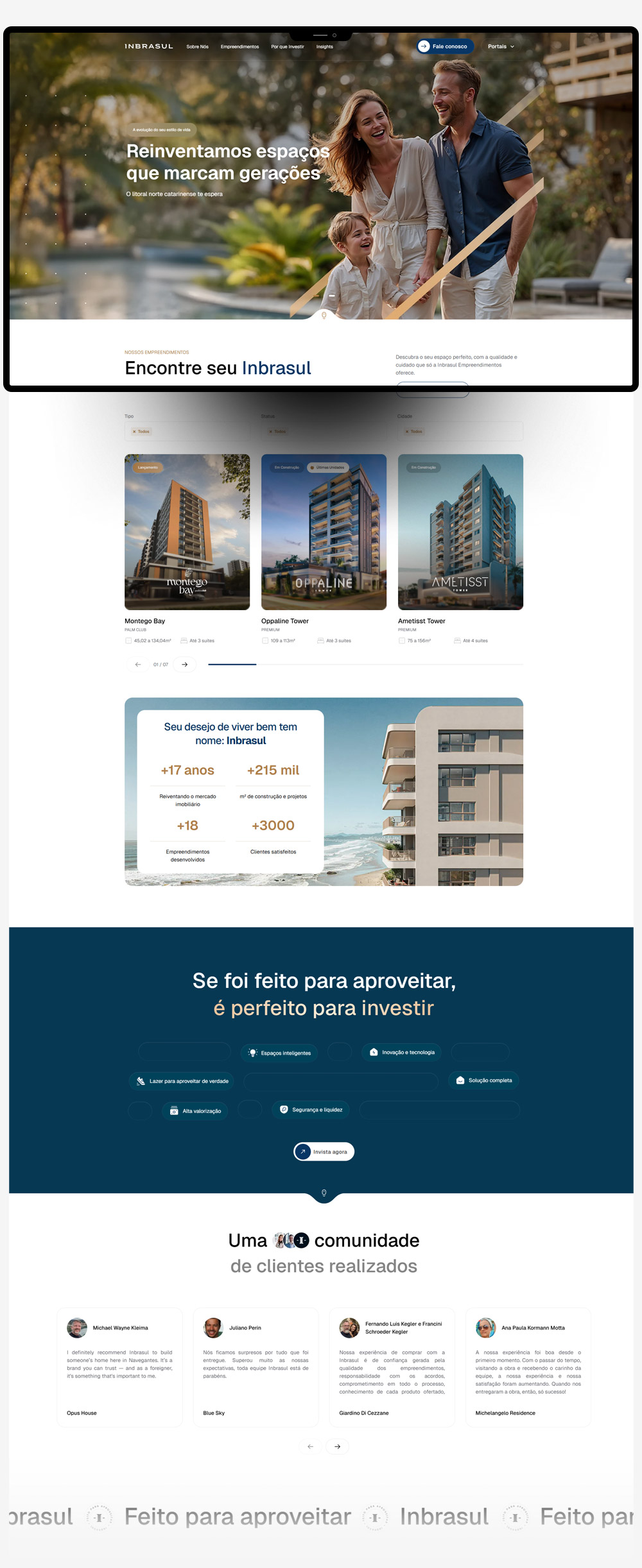 A Inbrasul é uma das construtoras mais tradicionais e respeitadas do litoral catarinense, com empreendimentos de alto padrão voltados para moradia e investimento. Para fortalecer sua presença digital, desenvolvemos um novo website com foco total em estética, usabilidade e performance.